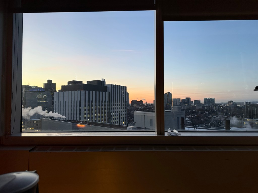 The Ellison Building is one of the older buildings on the MGH campus. As such, it still has small rooms that have 2 patients per room. This is not ideal for many reasons. When I arrived, I had the luck of being placed in a room with a bed by the window. On the 16th floor, the views of Boston were beautiful.